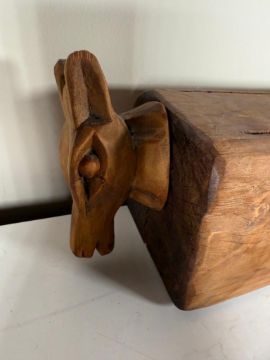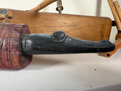 Lot of handmade instruments includes a Garamut drum from Papua New Guinea, which features intricately carved animal figures on either end; a hand carved African wood carved drum, an Ethipian Sistrum, which is an instrument used in Ethiopian Orthodox churches; and a Burmese Fulu jewlew flute from the Lisu tribal people (has a crack in it).