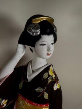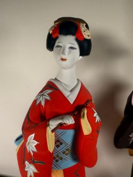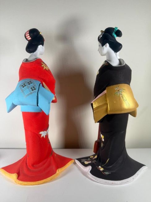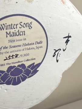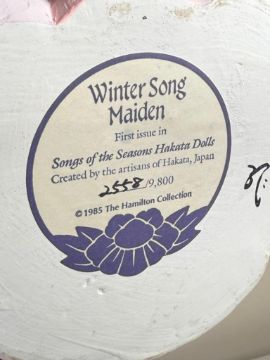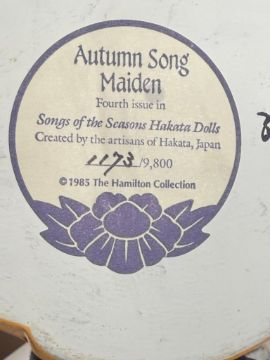 Vintage Hamilton Collection Hakata Dolls: Autumn Song Maiden & Winter Song Maiden.  Each is from a limited edition.  They are signed and numbered.  Each has minor condition issues including a chip on the hand of one and the base of the other.